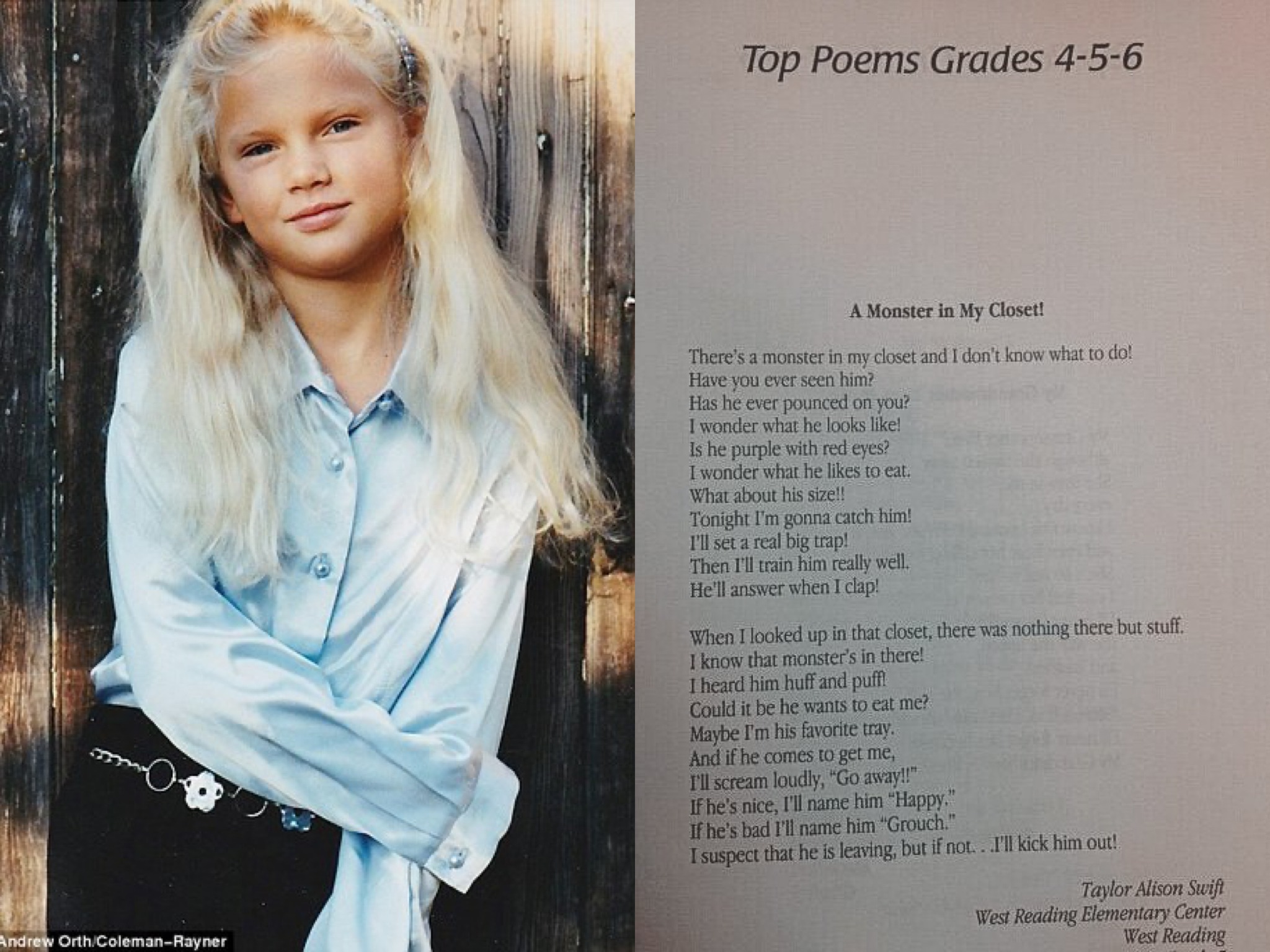 She wrote a poem in her fourth grade, “A Monster in My Closet”, for which she won a national poetry contest held by Creative Communication.